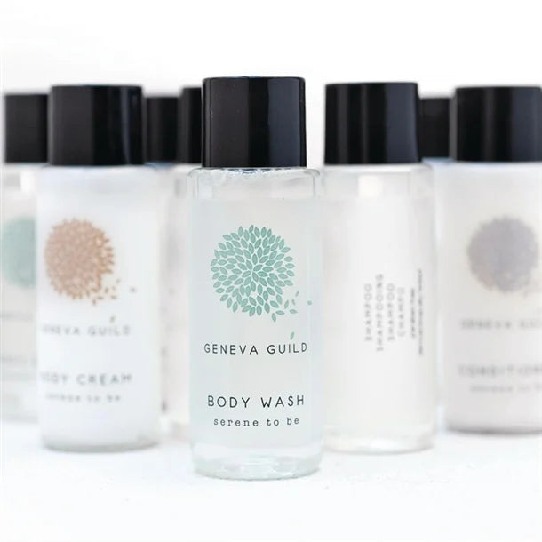 - This pack of beautifully scented 300 individual bottles of body wash is ideal for guesthouses, hotels and B&Bs to give your guests a touch of luxury during their stay. This neutral and contemporary range of essential toiletries uses bottles made from PET and a high biodegradable content. With a lightly perfumed scent and extract of Aloe flower, these high quality stylish bottles of body wash are sure to keep your guests returning.