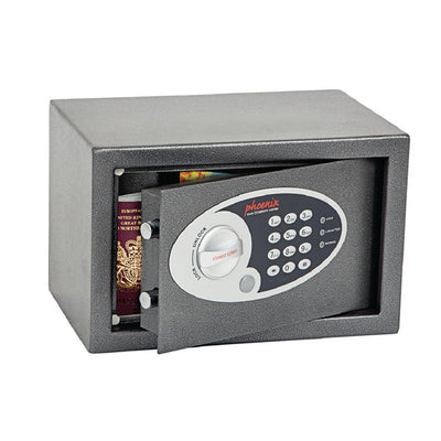 - Prevent thefts in your establishment with this premium 17 litre Phoenix Vela security safe. Boasting a 4mm-thick steel door, concealed internal hinges and an anti-tamper system, the safe is designed for optimal safety, keeping your cash, valuables and important documents securely locked away at all times. Featuring a user-friendly electronic lock, the safe is also incredibly intuitive to use, allowing your guests to effortlessly lock their goods away. Built with wall and base fixing holes, the safe can be fixed onto any brick walls or concrete floors, preventing the theft of the safe itself. A bright interior LED light also illuminates the safe when opened, allowing you to easily see your valuables in even the darkest of rooms. Requires 4 x AA batteries.