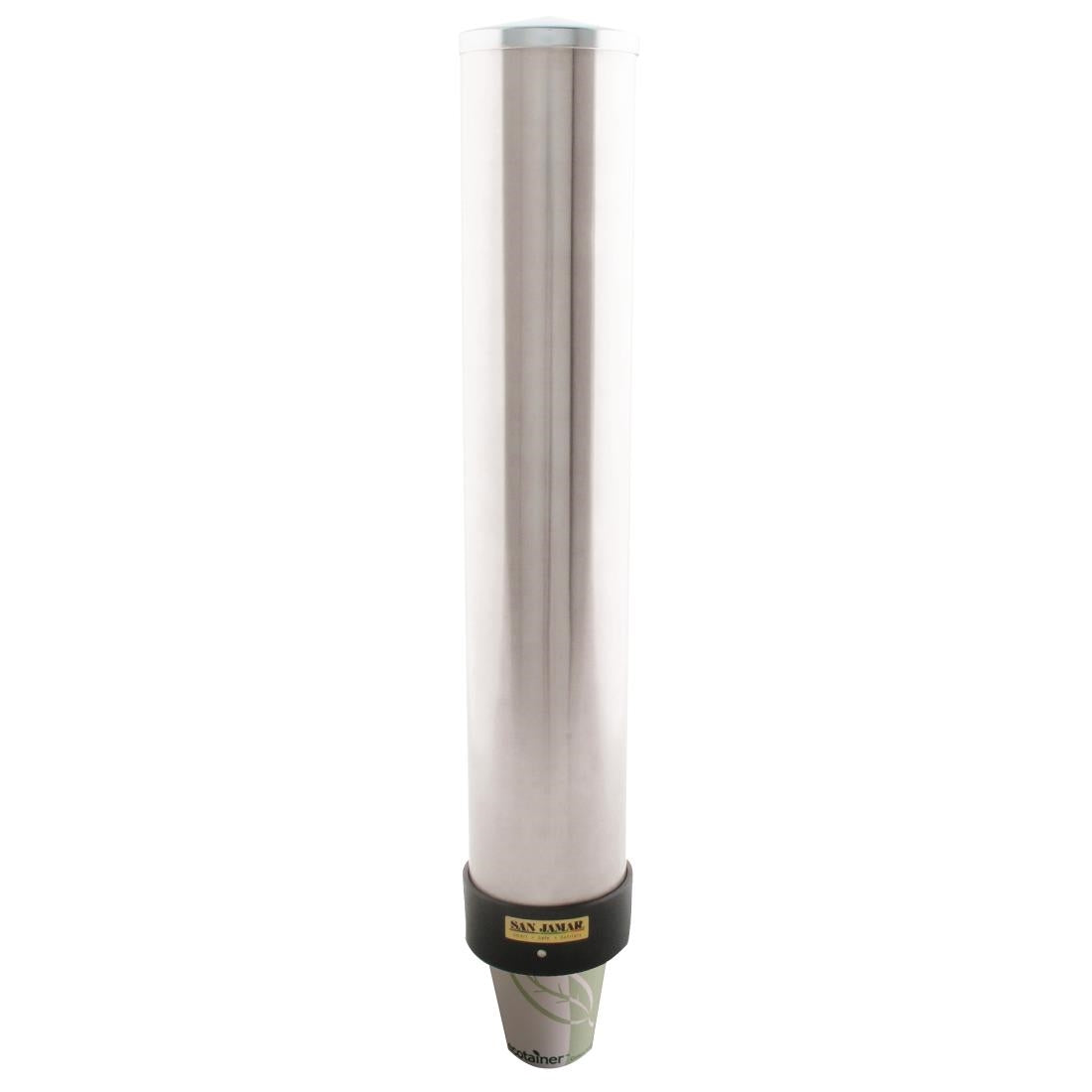 Reduce waste, optimize efficiency with this wall mounted cup dispenser from San Jamar. With a collar which automatically adjusts to the correct size for the cup loaded, this dispenser can store cups between 12oz and 24oz - making one-at-a-time cup dispensing is possible.