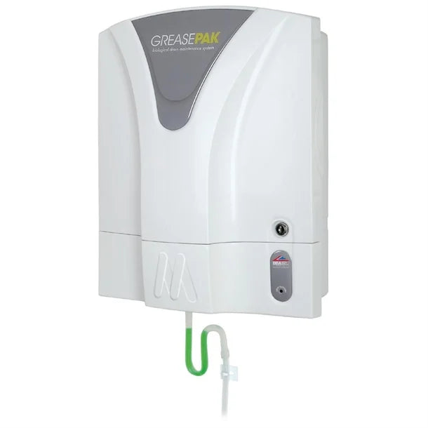 - Plus, within the GreasePak module, there are no floor drums or containers to be replaced, but instead a bio fluid pack can be quickly, safely and hygienically replaced - maintaining free-flowing drains and saving costs. It's also easy to clean, with only a disposable cloth and fresh water required. The wall-mounted GreasePak module is ideally used in busy kitchens and food preparation areas, blending easily into its surroundings with neutral colours.