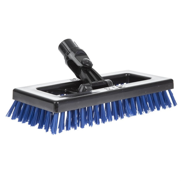 - With stiff bristles and tough polypropylene head, the SYR deck scrubbing brush is perfect for removing stubborn stains and dirt on any surface. Designed for efficiency, the rectangular bristle construction means that dirt and debris are brushed twice with each sweeping motion. To ensure flexible and vigorous cleaning, the brush head is double hinged so it can easily move from up to down or left to right.