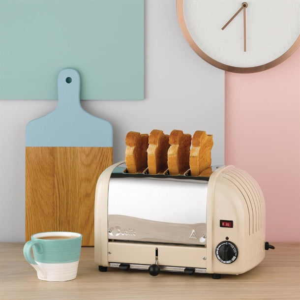 - Designed to withstand the rigours of continual use within a busy commercial kitchen, the Dualit 4 Slice Vario Toaster Utility Cream features award-winning ProHeat elements and extra wide 28mm slots. These slots mean it can accommodate the thickest breads, teacakes and even sandwiches (using a Dualit sandwich cage, available separately). A mechanical timer allows precise control of toasting and a manually operated ejector lever keeps items warm until required, while a high lift mechanism allows easy and safe removal of small items. This Dualit toaster also features a selector switch meaning only the slots needed are heated, saving energy in quieter periods and allowing for consecutive toasting.