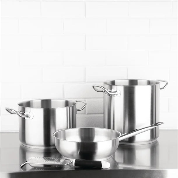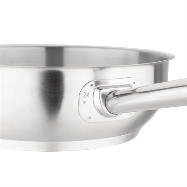 - With their exceptional cooking performance and extra strong build quality, Vogue stainless steel sauté pans are a great choice for both the home and professional kitchen. Thanks to heavy duty 18/10 stainless steel construction and the aluminium base, the sauté pan is perfect for constant commercial use, whether you're sautéing, frying or flambéing food.