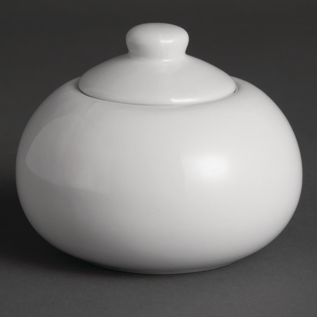 An appealing, pure white sugar bowl and lid by Olympia, designed to provide a great value and hardwearing porcelain crockery solution for busy hotels, canteens, casual dining restaurants and cafés. Strengthened rolled edges ensure the bowl and lid are chip resistant and a fully vitrified body gives great glaze durability, making them ideal for withstanding the rigours of the professional catering environment. The bowl is stackable, helping maximise storage space, and oven, microwave, dishwasher and freezer proof.
