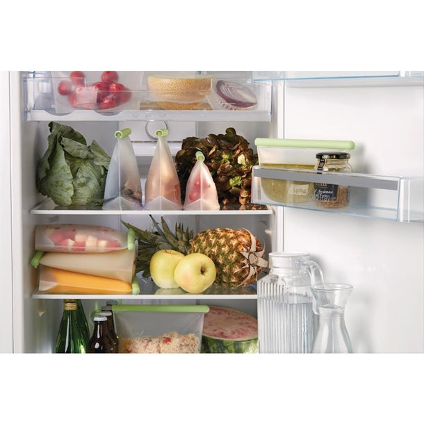 Eco-friendly non-plastic food storage bag suitable for preserving multiple food stuffs, hermetically sealed and can either lie flat or be freestanding. Easy clean. Use and reuse time and again. 100% platinum silicone derived from sand - suitable for freezing and heating.