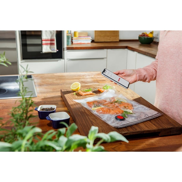 • Place the powerful vacuum pump (sold separately) onto the valve and extract the air out of the bags in just seconds. The only thing left to do is push button in the middle of the red silicone valve to seal it securely - aromas and vitamins are safely preserved and food stays fresh up to five times longer.