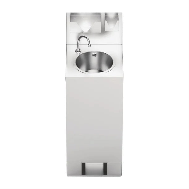 • This sturdy stainless steel unit comes with a built-in soap and towel dispenser that also doubles up as a rear upstand to protect against splashes. All are easy to wipe clean in seconds. The station is also mounted on large wheels, helping you move or position it with ease.