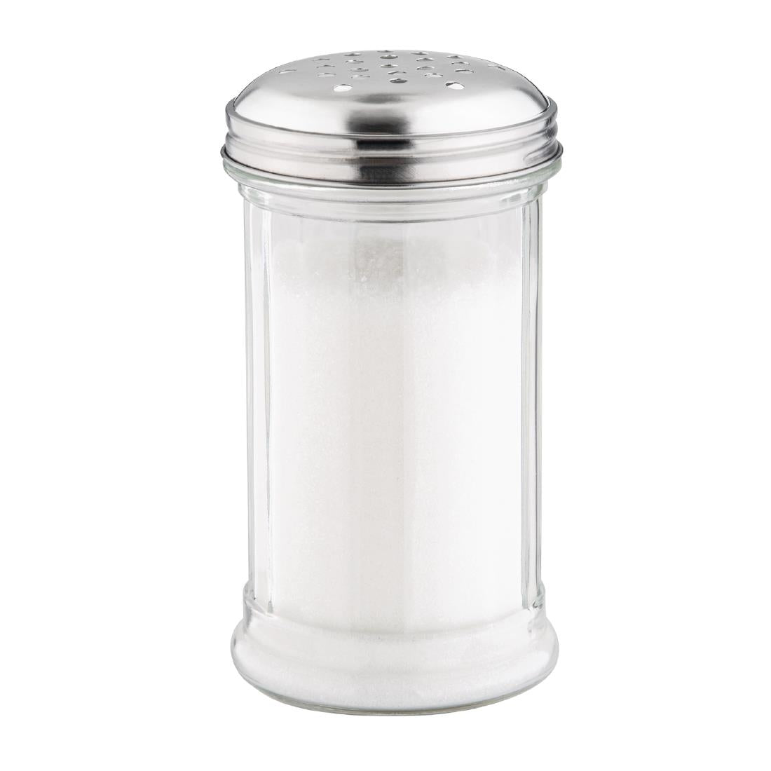 - A large glass sugar pourer with a stainless steel lid featuring 2.5mm multi holes. The even spread of holes helps to control the amount of sugar you want. With the same layout also available with 4mm holes (C236), it's easy to find the perfect sugar dispenser for any cafe or coffee shop.
