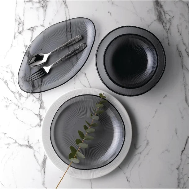 A fresh alternative to traditional crockery, the Bamboo Glass Plate is ideal for dishes with a difference. Finished in a smoky grey, and featuring the embossed line pattern that makes the Bamboo collection so striking, it's at once sophisticated yet daringly different. Perfect for pairing with other crockery pieces for a fresh way to serve up everything from starters to mains, or for using alone as a platform for those show-stopping dishes, this is tableware that's made to impress. Pair with cutlery from the Bamboo collection - featuring the same statement lined finish - to complete the look.