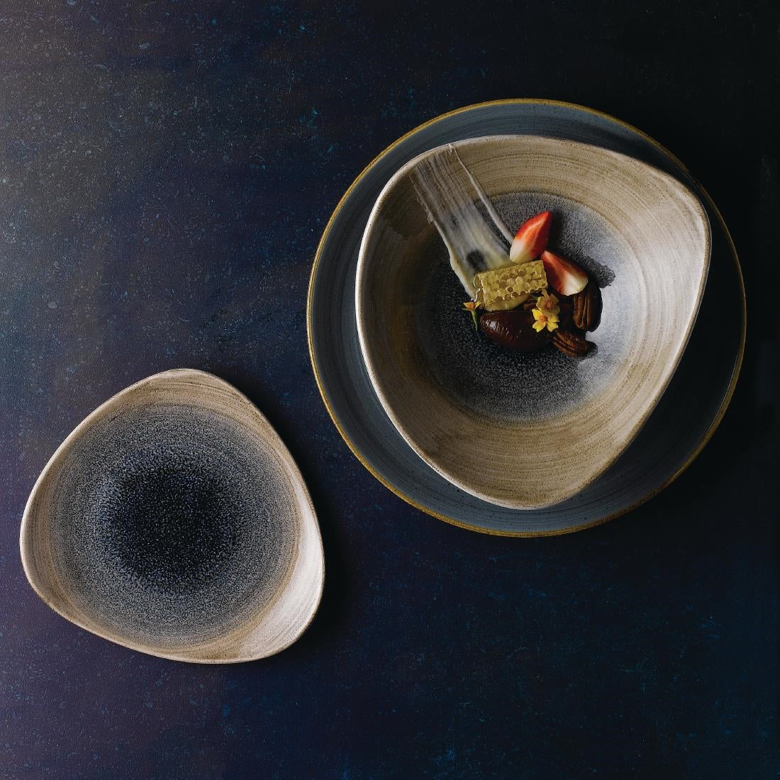 Bold dishes need a bold backdrop. Inspired by the fluidity of water, the Aqueous Triangular Bowl features a striking glaze that pools in the centre. Contrasting beautifully with the earthy tones of the outer rim, this signature glaze gives a rustic twist to whatever you choose to plate on it, playing on the organic roots of more traditional dishes. The triangular shape adds the finishing touch, giving you a wide canvas on which to creatively plate show-stopping dishes while breaking up table tops laid with all-circular crockery to add an extra layer of visual interest. Finished with a superior glaze, the Aqueous is as strong in build as it is in looks, giving you crockery that's as much style as it is substance.
