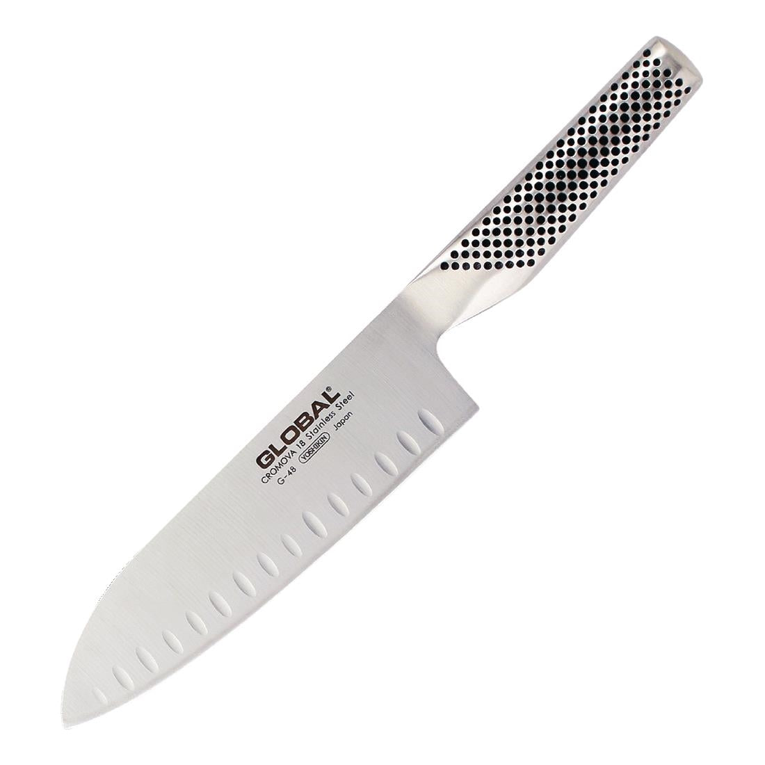 - The Global G-80 Santoku fluted knife boasts a smooth, seamless construction that ensures there are no dirt traps. This makes the knife hygienic and easy to clean, perfect for commercial kitchens. The handle features little dimples for enhanced grip, which provides increased safety and control when preparing food has little dimples on them for enhanced grip. It is also hollow, enhancing its balance and giving it a comfortable lightweight feel.
