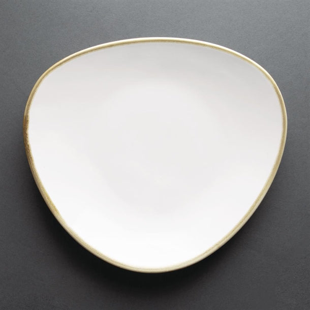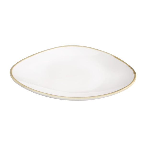 Bring your dishes to life with the charming Chalk White Triangle Plate from Olympia Kiln. Finished in a soft and creamy white, it's the perfect backdrop for any vibrant dishes, giving the bold tones in the fresh ingredients you use a neutral backdrop against which to pop, ensuring your dishes burst with energy. The hand applied rim adds the finishing touch, drip drying naturally to make each piece subtly unique - perfect for capturing the rustic, relaxed feel diners love, and that the farm to fork dining trend is all about. Designed to bring extra depth to your dining settings, the triangular shape helps to break up tables laid with all-circular crockery to bring something a little different to the table. Get creative with Kiln.