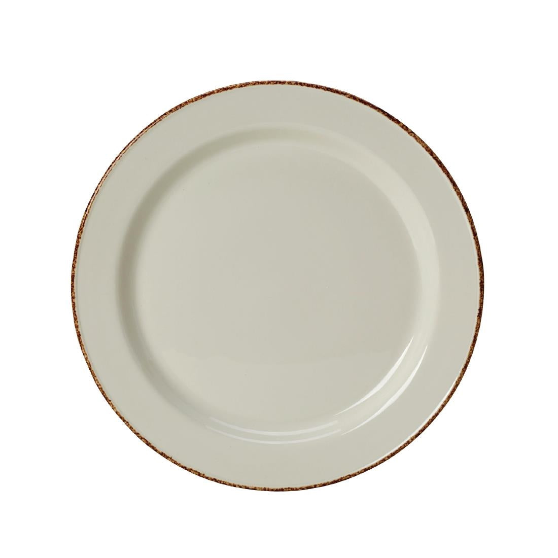 Give your dishes a classic and traditional feel with these slimline plates from Steelite. Featuring a classic, shallow rim and dappled brown edge, these round plates offer understated and earthy tones to emphasise the natural goodness of your food. Made of Alumina-enriched porcelain, these plates are strong enough to withstand heavy commercial usage and work well with other crockery from the Steelite Brown Dapple range. Dishwasher, microwave and freezer safe.