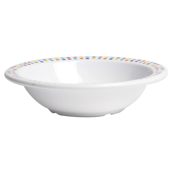Melamine is a strong, lightweight and hard, thermosetting plastic which is an ideal hygienic and durable alternative to china. These 6" bowls by Utopia feature a white body with a multi-coloured mosaic effect around the rim; they are perfect for meeting the tough demands of everyday use in schools, hospitals and care homes.