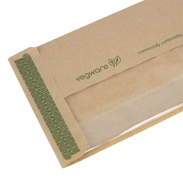 Sustainable food-to-go serving is made simple with this pack of 1000 x Vegware compostable kraft baguette bags. Made from paper and feature a plant-based, PLA window which allows them to be industrially composted within once used. This will help you send less waste to landfill, and instead turn your used packaging into compost that's used to grow plants.