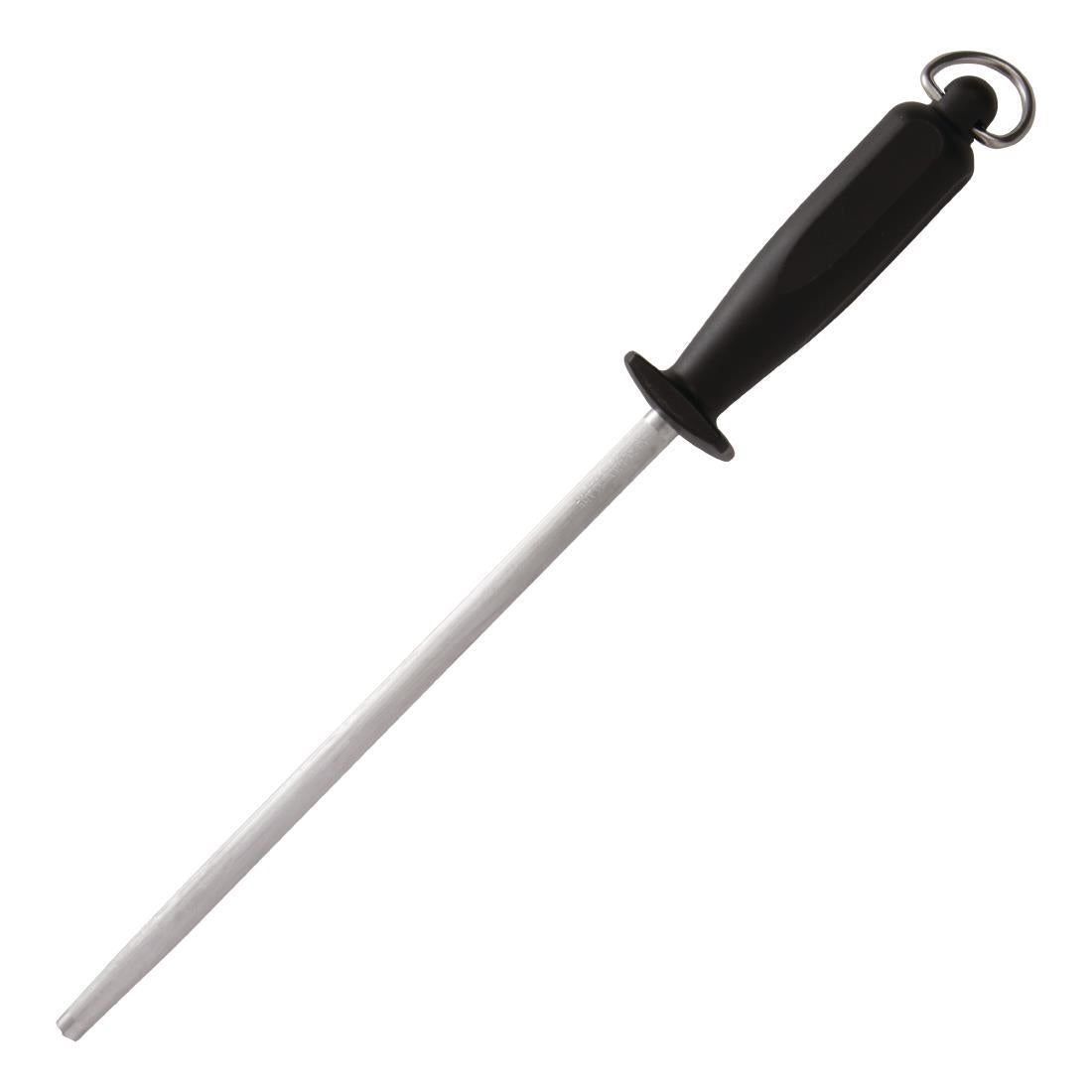 - Keep your kitchen knives in pristine condition with this sharpening steel from Victorinox. Made from high-carbon stainless steel, its coarse rod delivers a medium-fine cut and gently re-aligns the blade edge to ensure even and accurate cuts, every time. The handle is made from Fibrox, a durable and non-slip material that provides a firm and comfortable grip during use. The handle is complemented by a guard that prevents fingers from sliding forward or over the blade. For easy care, this Victorinox sharpening steel is dishwasher safe and comes fitted with a metal hanging hoop for storage.