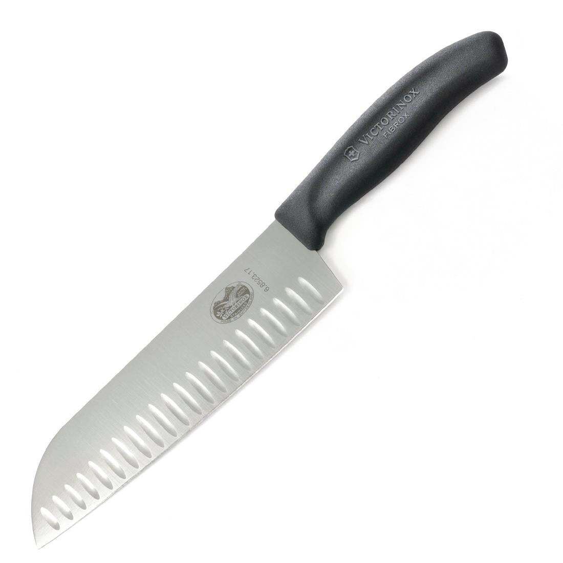 - Providing a functional and versatile design, the Victorinox Santoku knife makes for an excellent addition to your preparation tasks. The 6.75" blade features a broad construction that makes slicing through the toughest of produce effortless - with no cost to the quality of the results. The blade also features a fluted edge that prevents food items from sticking to the blade, allowing you to quickly complete preparation tasks.